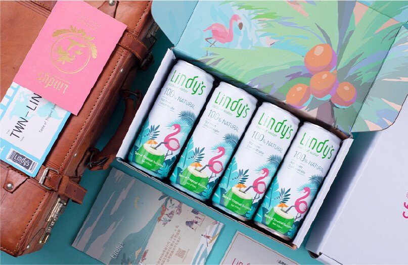 打開箱子能看到機票風格的品牌小卡以及護照樣式的主題卡片。品牌小卡上印製「TWN→Lindy's」象徵以臺 灣作為出發地打造Lindy's品牌,並記錄這次推出的「Lindy's椰子水」特點,以媲美搭乘高檔航班旅程的體驗 來認識Lindy's品牌。