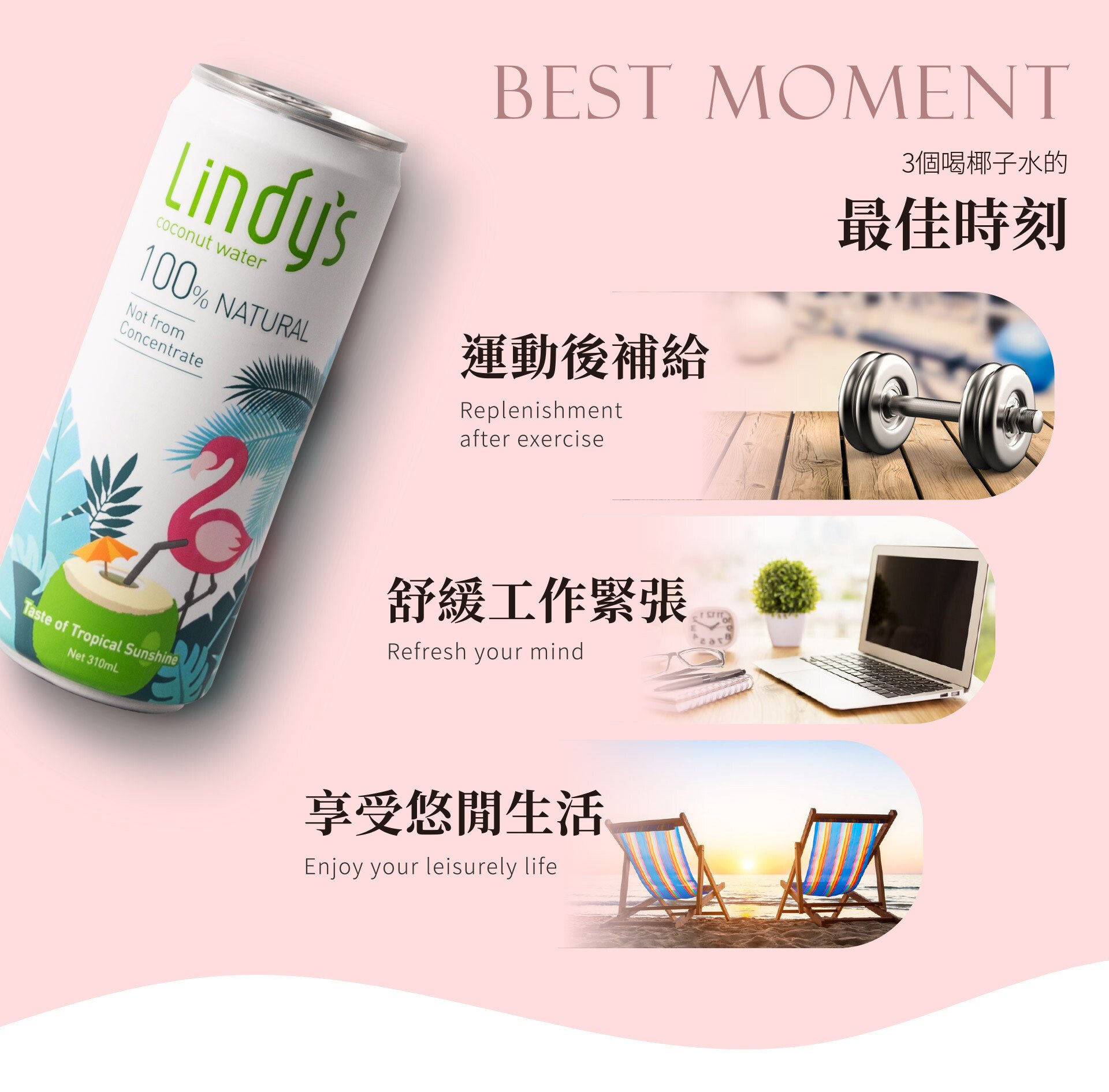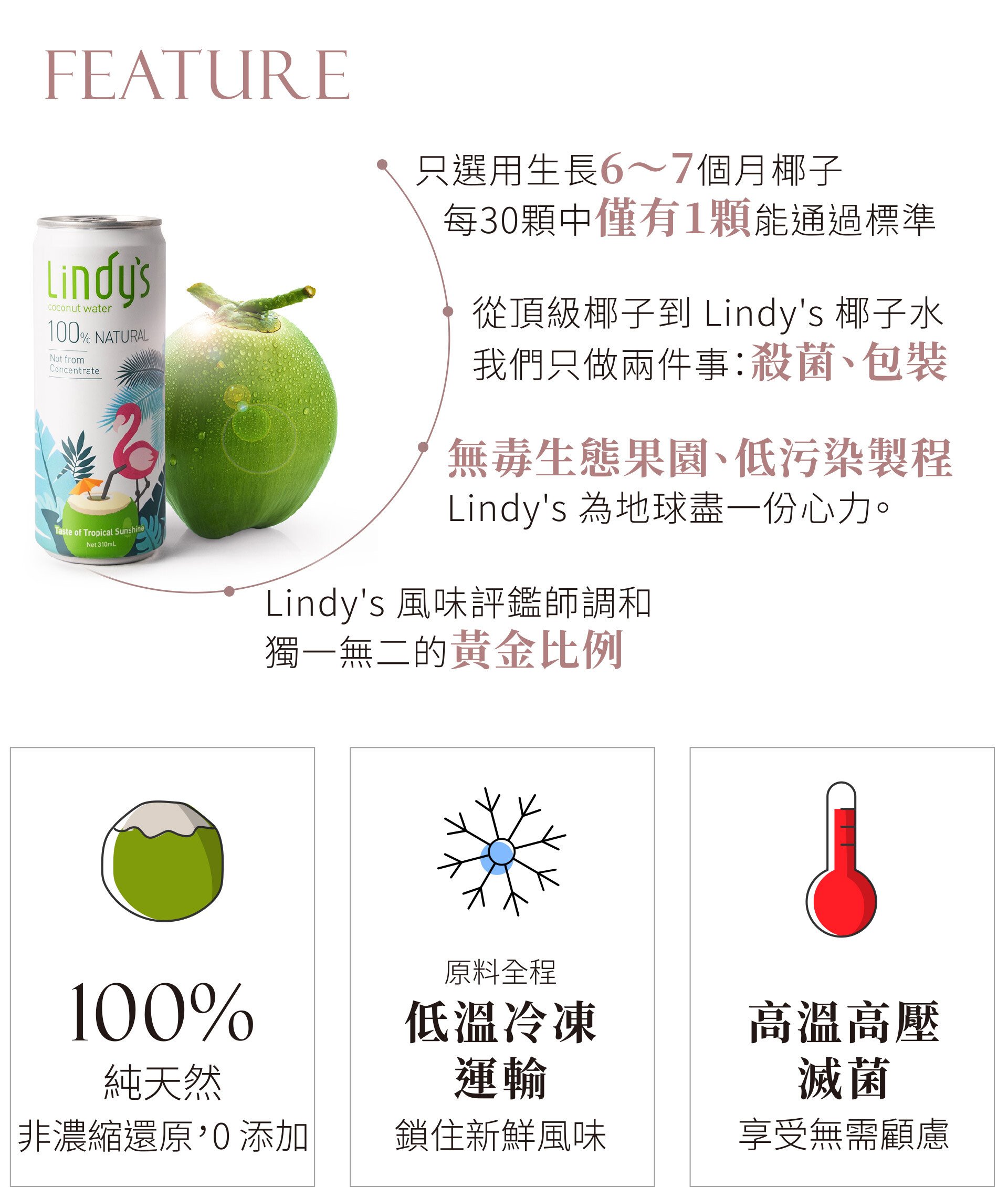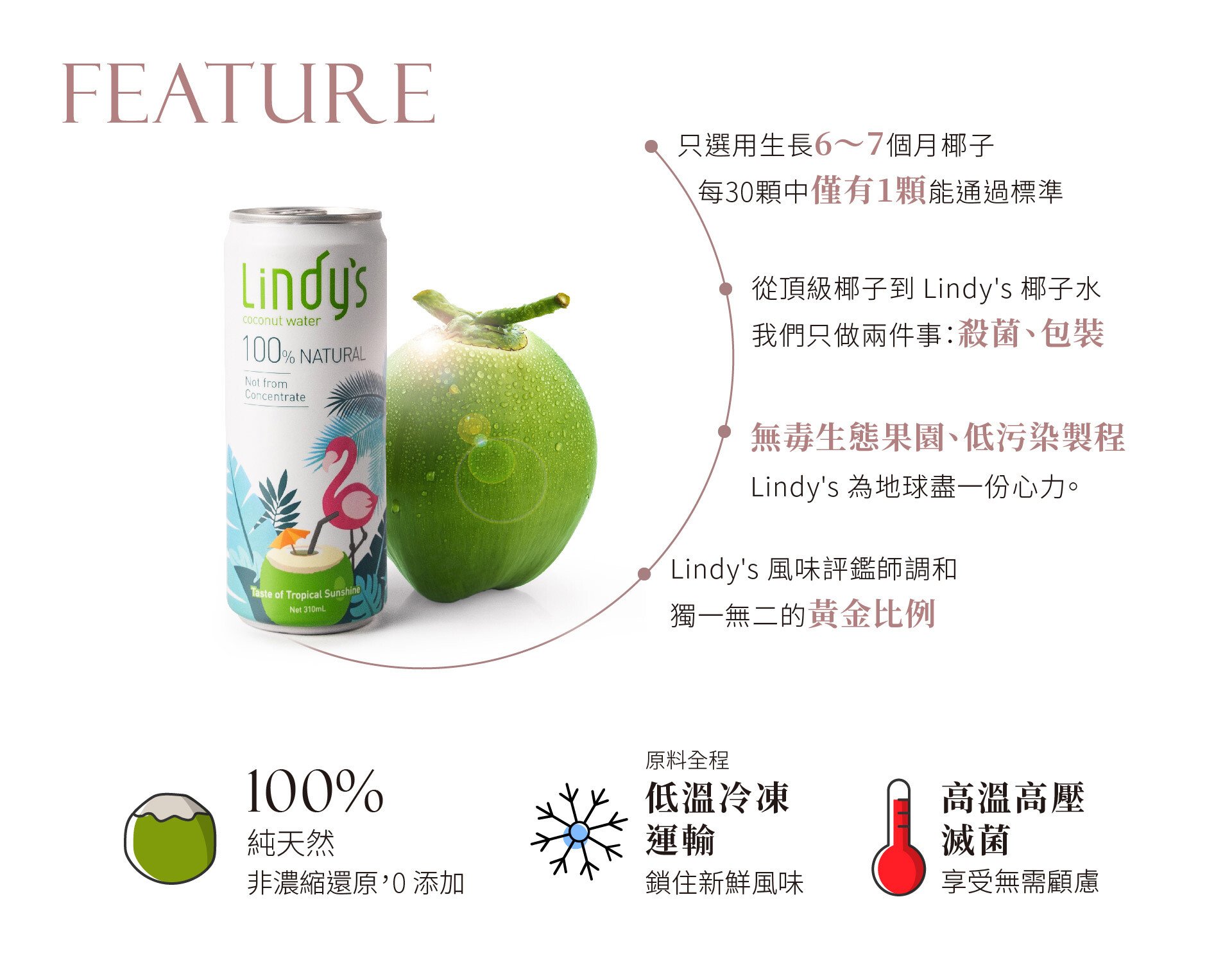 products產品介紹LINDY‘S 椰子水24入裝〔新品上市〕泰國原裝進口 黃金比例椰子水1190★ 1 0 0 % 純天然,非濃縮還原,0 添加 ★ 只選用生長 6~7 個月椰子,每 3 0 顆中僅有 1 顆能通過標準 ★ 從頂級椰子到 LINDY‘S椰子水,我們只做兩件事:殺菌、包裝 ★ 原料全程低溫冷凍運輸,鎖住新鮮風味 ★ 高溫高壓滅菌,享受無需顧慮 ★ 無毒生態果園、低染製程, LINDY‘S為地球盡一份心力 ★ LINDY‘S風味評鑑師調和獨一無二的黃金比例 加入購物車CART 立即購買BUY 商品說明規格說明 規格說明(單瓶)品名Lindy’s 100% 椰子水淨含量310毫升原料100% 椰子水有效日期如包裝上顯示(西元年/月/日)保存期限730天進口商欽宇食品有限公司地址臺北市中山區中山北路2段93巷22號2樓2F電話02-27711991原產地泰國食品業者登錄字號F122188176-00000-8投保產品責任險字號明台產物0885第10PDT00355號營養標示每一份量200毫升 本包裝含1.5份 每份每100毫升每日參考值百分比熱量40 大卡20 大卡2 %蛋白質0 公克0 公克0 %脂肪0 公克0 公克0 %飽和脂肪0 公克0 公克0 %反式脂肪0 公克0 公克*碳水化合物9.8 公克4.9 公克3.3 %糖8 公克4 公克*鈉54 毫克27 毫克2.7 %鈣28 毫克14 毫克2.33 %鉀384 毫克192 毫克*